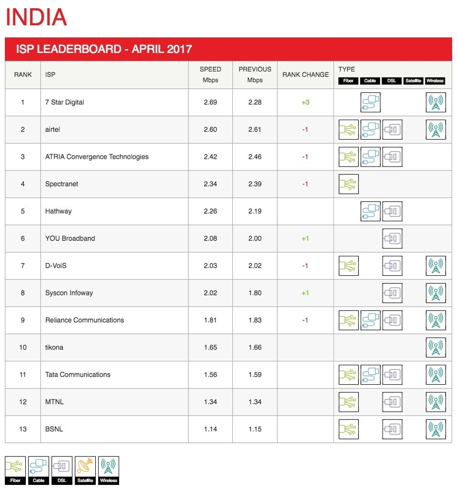 India’s 7 Star Digital improved its performance, with speeds rising by 0.41 Mbps to reach an average of 2.69 Mbps, elevating it three positions to claim the top spot in the country for the first time.